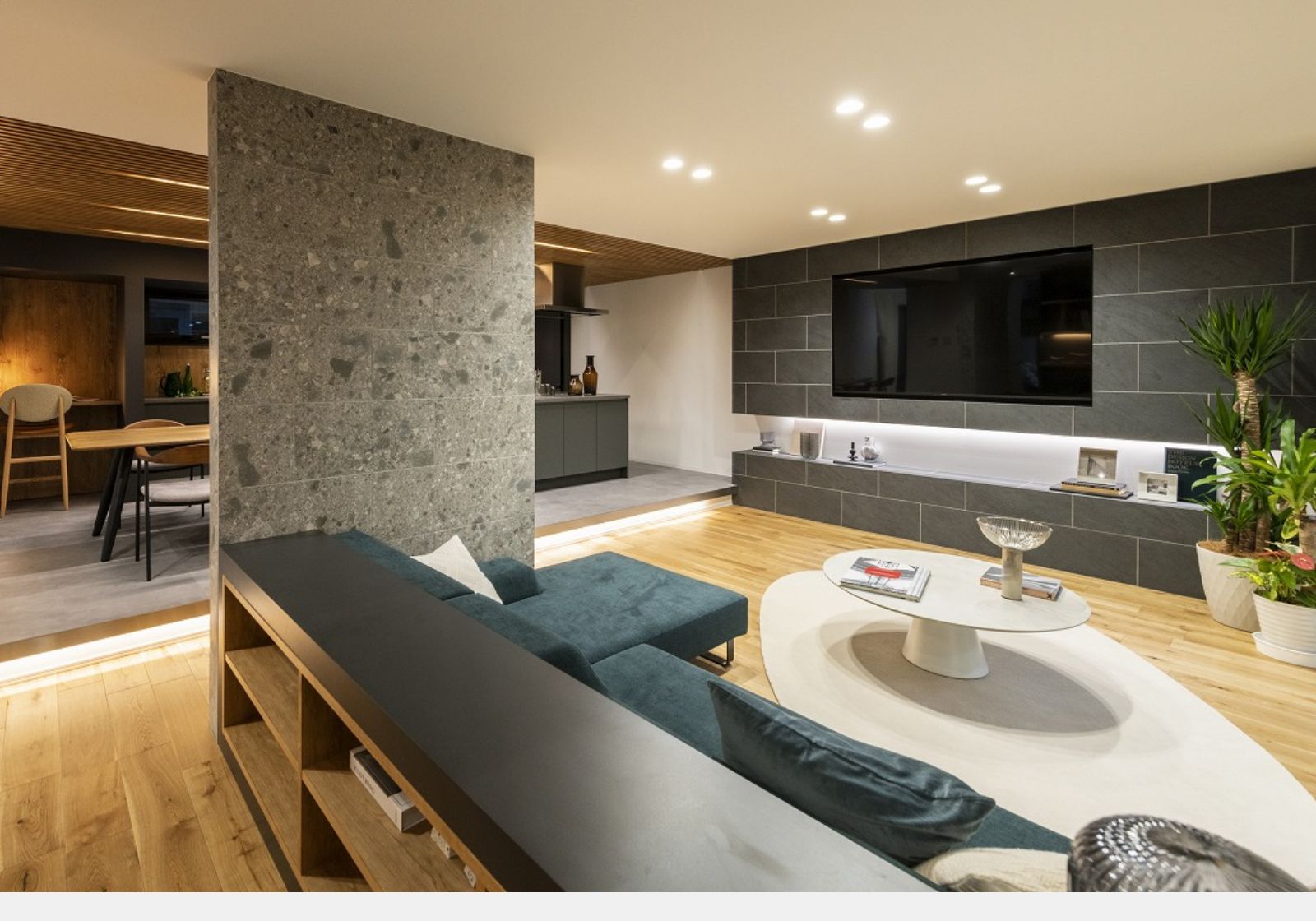 機能性とデザインが融合したキッチン&ダイニングキッチンは間接照明で空間に奥行きを与え、落ち着いた雰囲気に。ストレートダイニングにはカウンターを設置し、スタディーコーナーやワークスペースとしても活用可能。配膳や片付けもスムーズにできる、家事動線を考えた設計です。