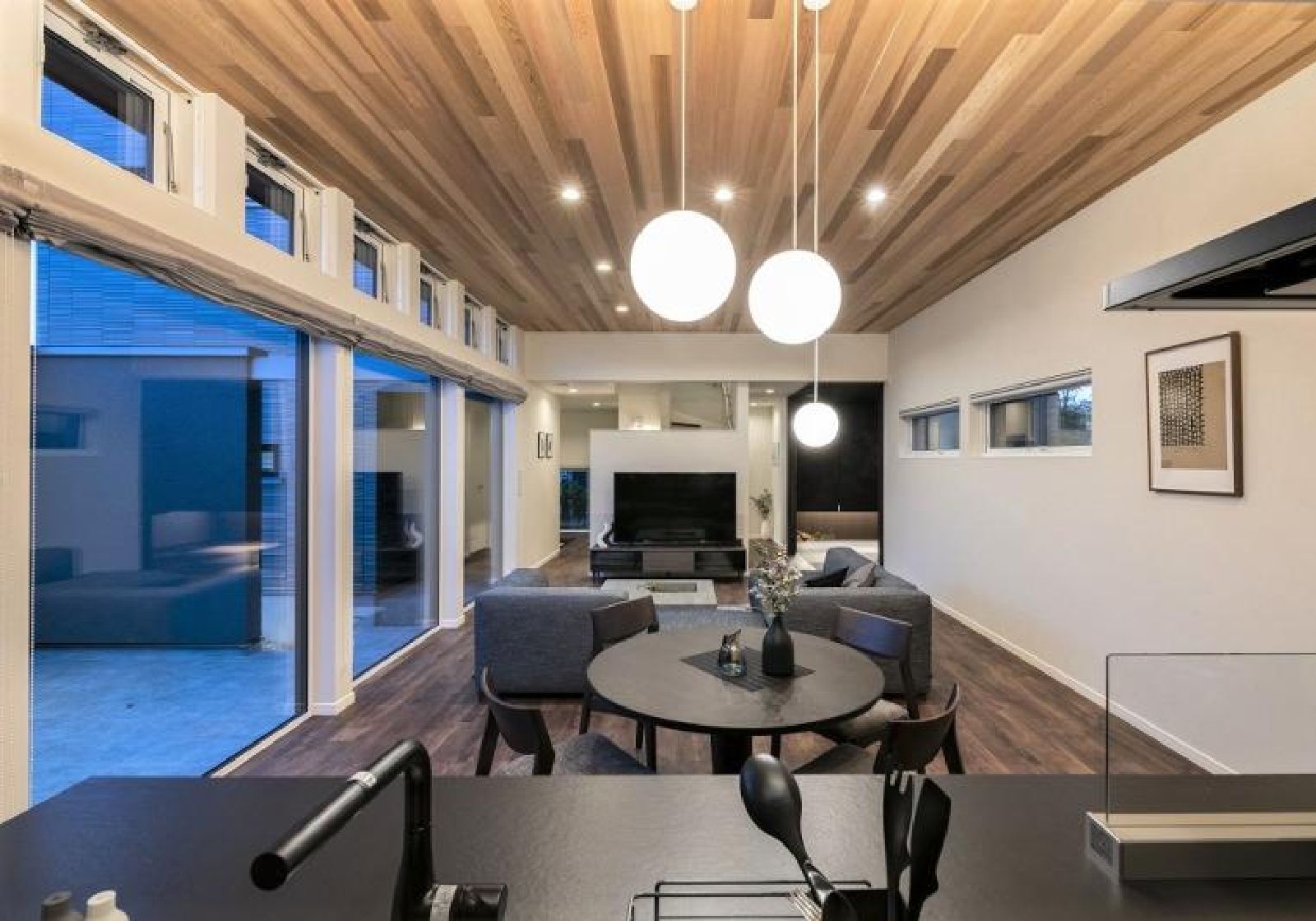 リビングドアを開けると、天井高が魅力の吹き抜け勾配天井が広がり、約11帖のリビングと10.5帖のダイニングキッチン。質感豊かな内装が高級感を演出し、洗練されたコーディネートでワンランク上の住空間を実現しています。