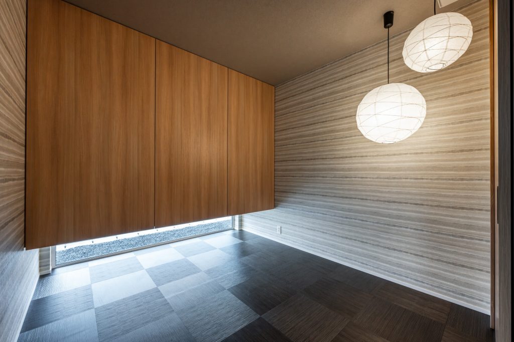 ゲストルームには畳ではなくラタン柄のフロアタイルを採用し、アジアンテイストの落ち着いた空間に。地窓と間接照明が明るさを確保しつつ、心地よいくつろぎを提供します。