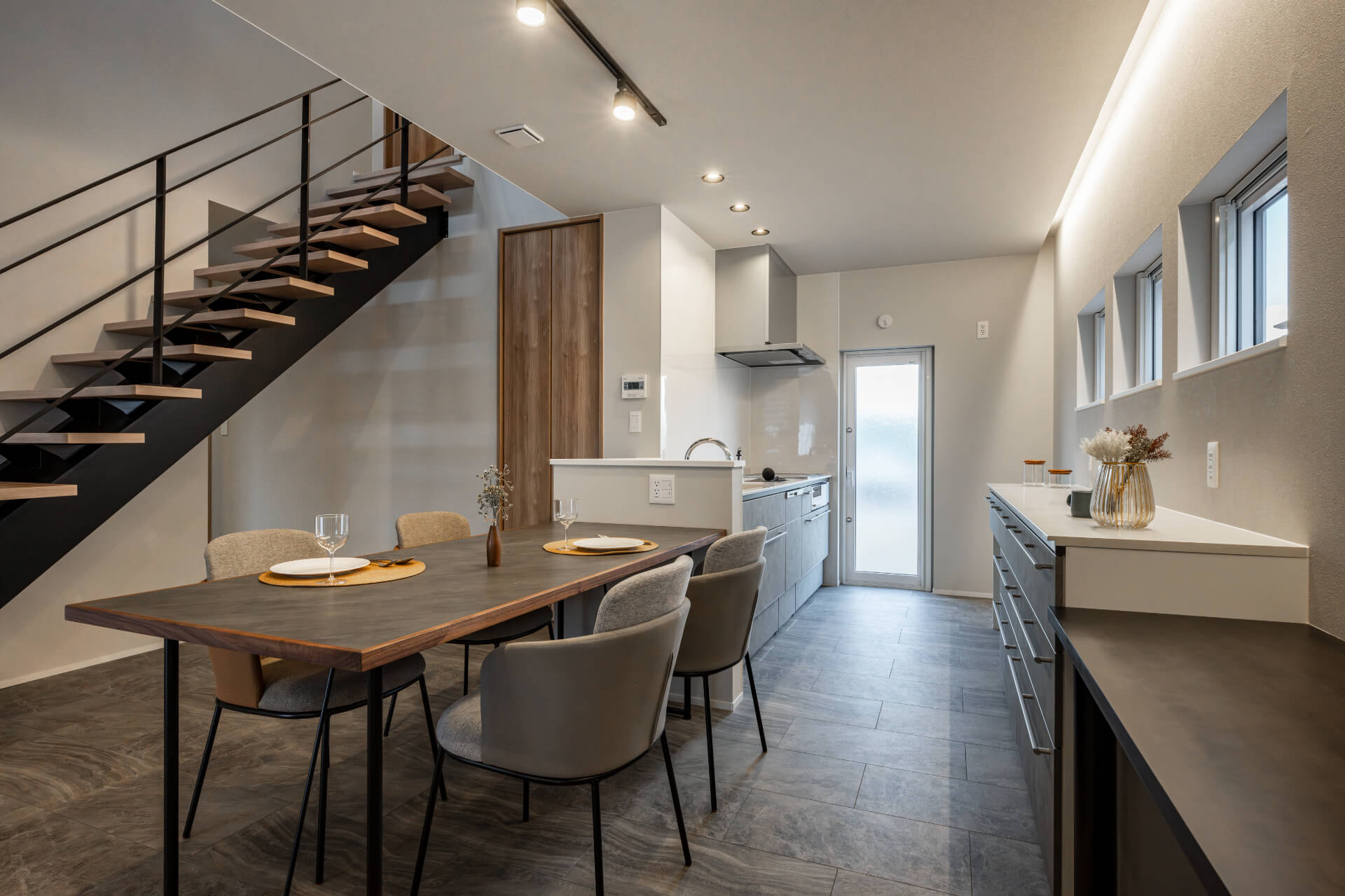 ストレートダイニングにはカウンターを設置し、スタディーコーナーやワークスペースとしても活用可能。配膳や片付けもスムーズにできる、家事動線を考えた設計です。