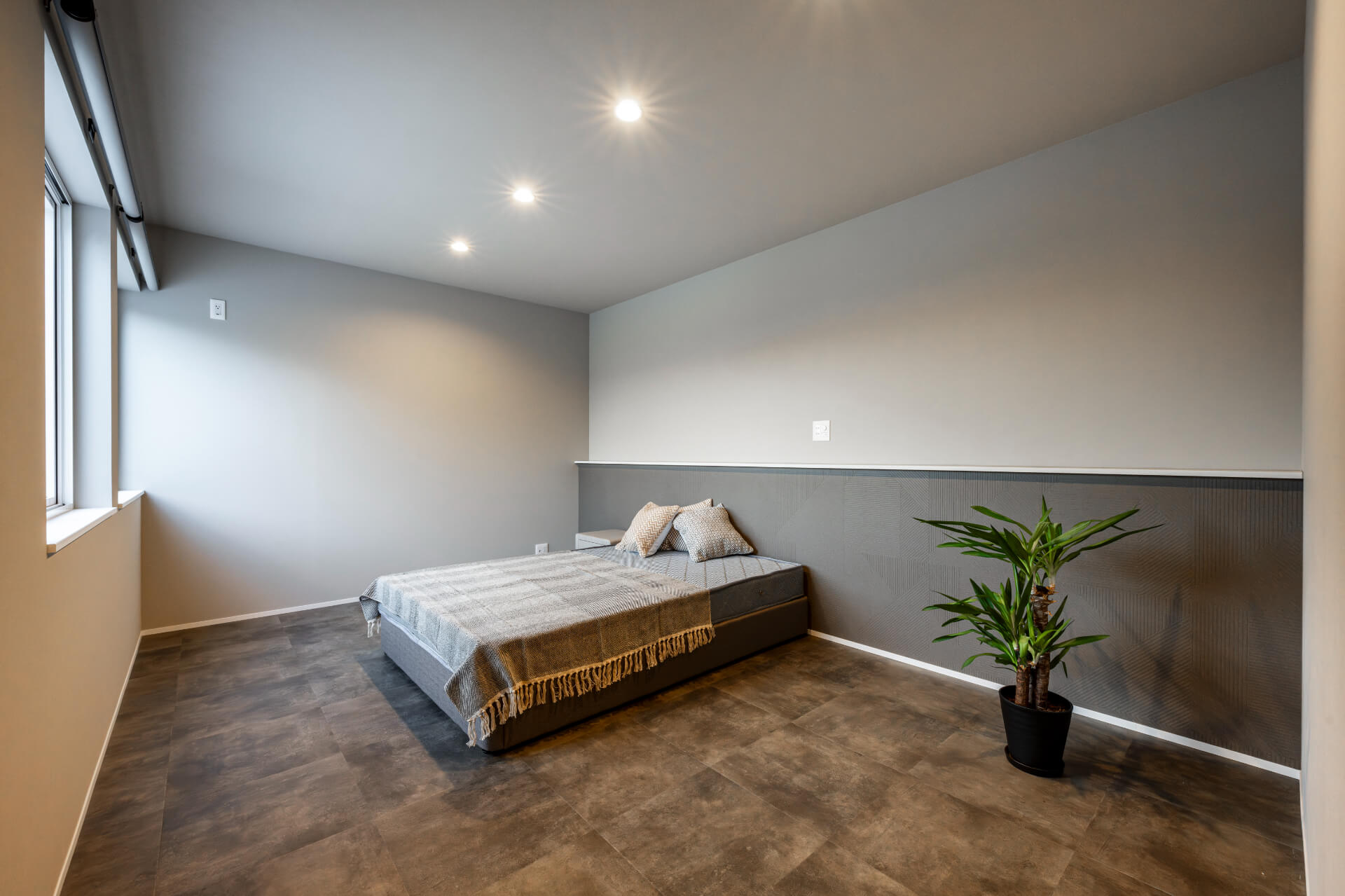 ゲストルームには畳ではなくラタン柄のフロアタイルを採用し、アジアンテイストの落ち着いた空間に。地窓と間接照明が明るさを確保しつつ、心地よいくつろぎを提供します。