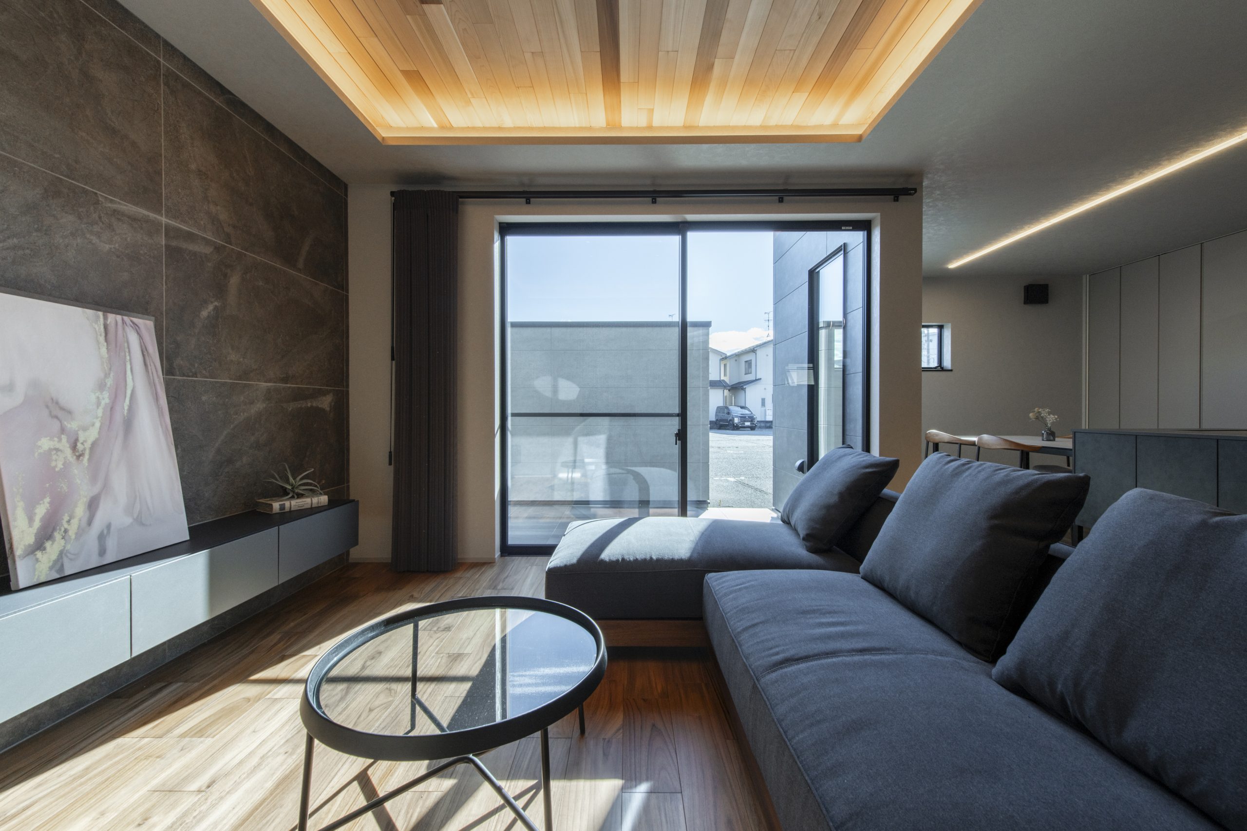 1. 大開口窓から注ぐ自然光と、計算された間接照明。 プライベートテラスがリビングを外へと広げ、 開放感の中で家族の時間が流れます。