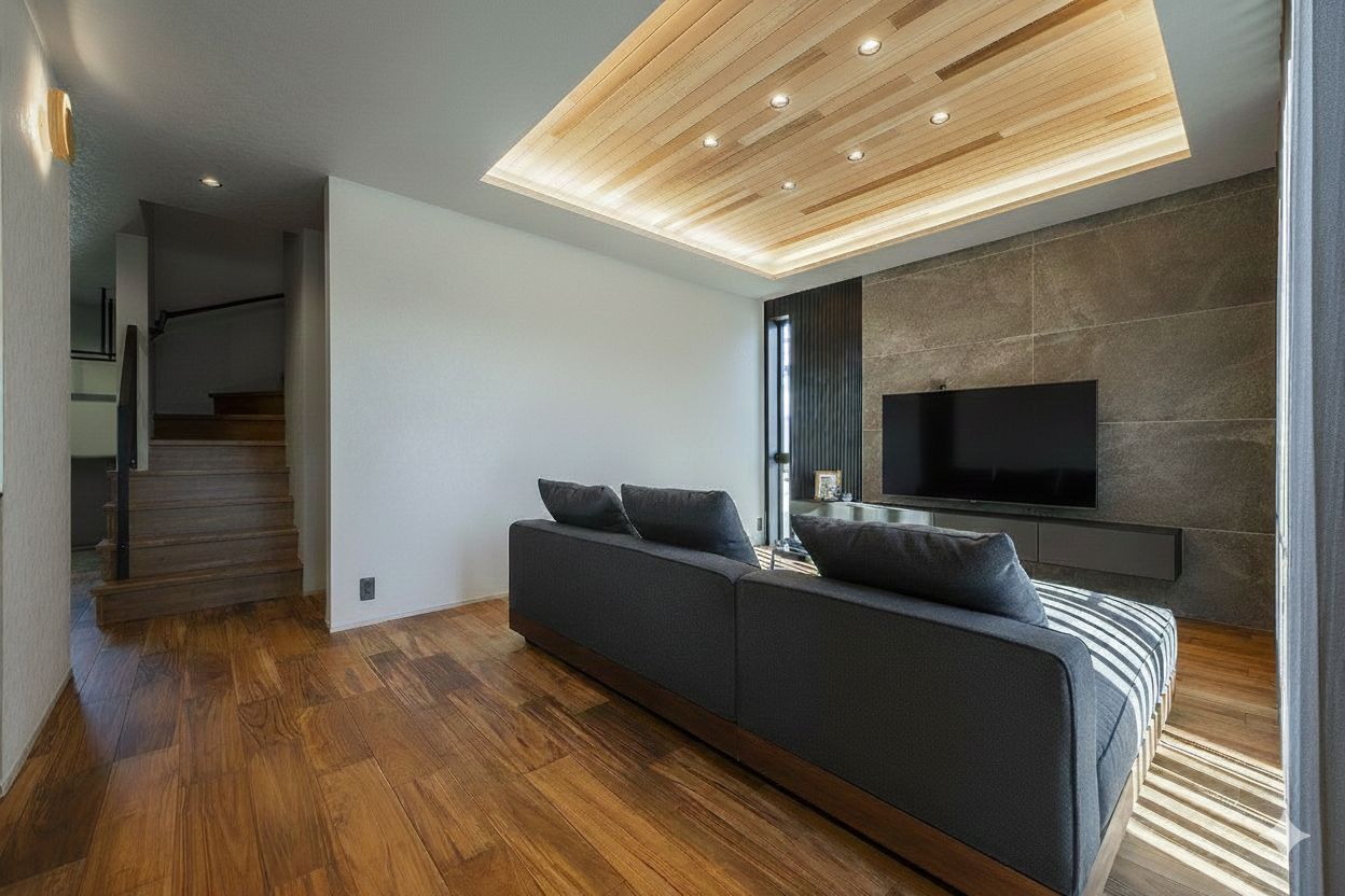 木目天井のあたたかみあるアクセントや、グレートーンで統一したキッチン・壁面の質感が、空間全体に落ち着いた上質感をもたらし、日常を豊かに彩ります。