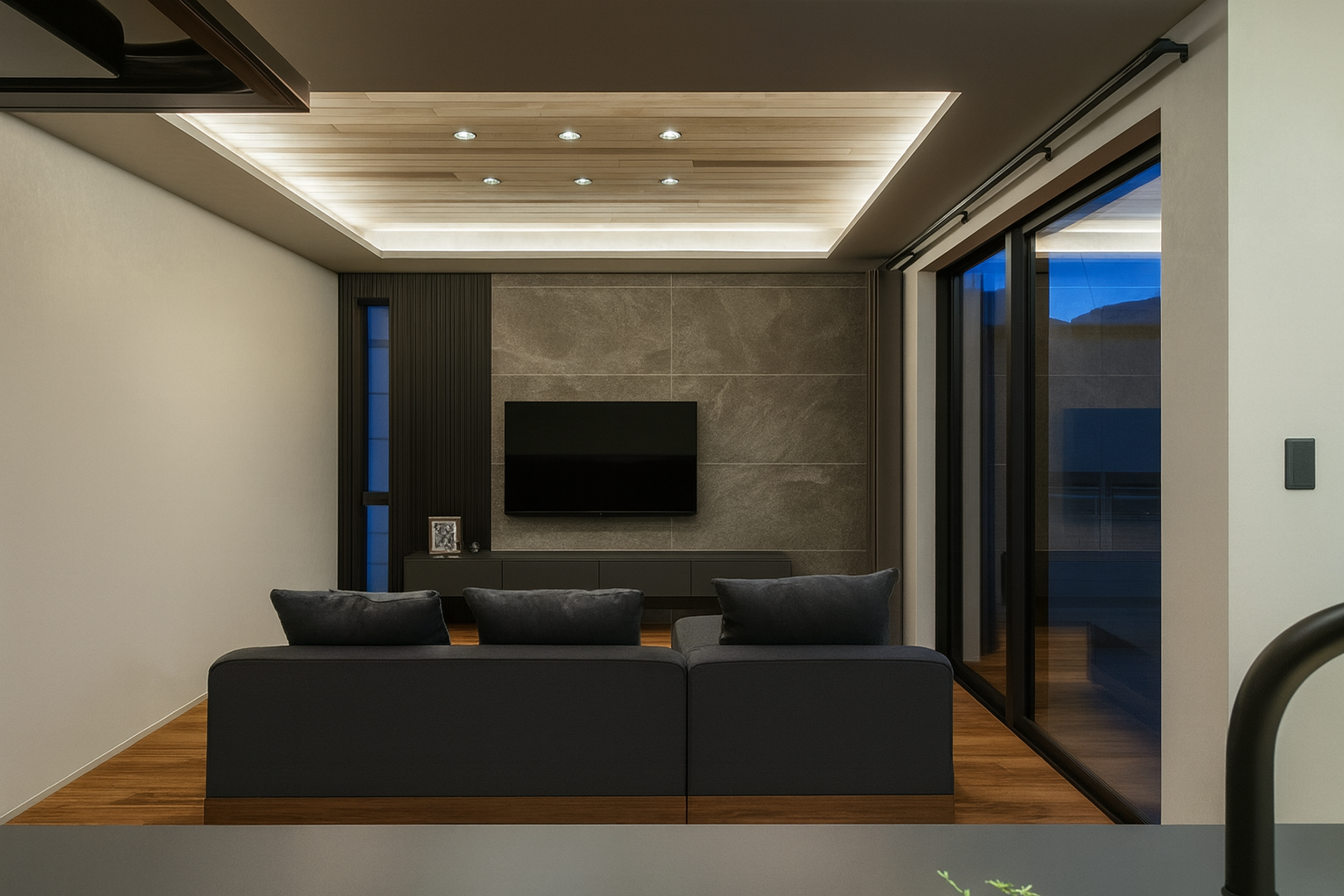 室内に入ると、外観のミニマルさからは想像できない開放的なLDKが広がります。大開口の窓から降り注ぐ自然光は、時間とともにその表情を変えながら、住まう人に心地よいリズムをもたらします。