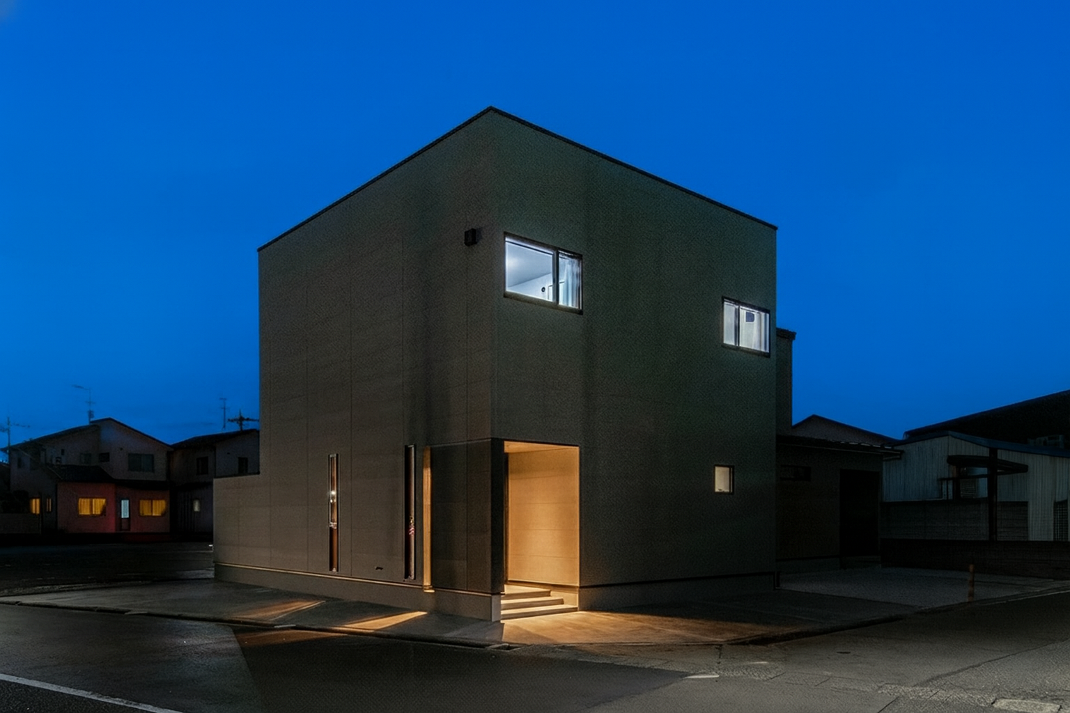 無駄を削ぎ落としたスクエアフォルムは、住宅街に凛とした存在感を放ち、ホワイトを基調とした外観が清潔感と上質さを演出します。