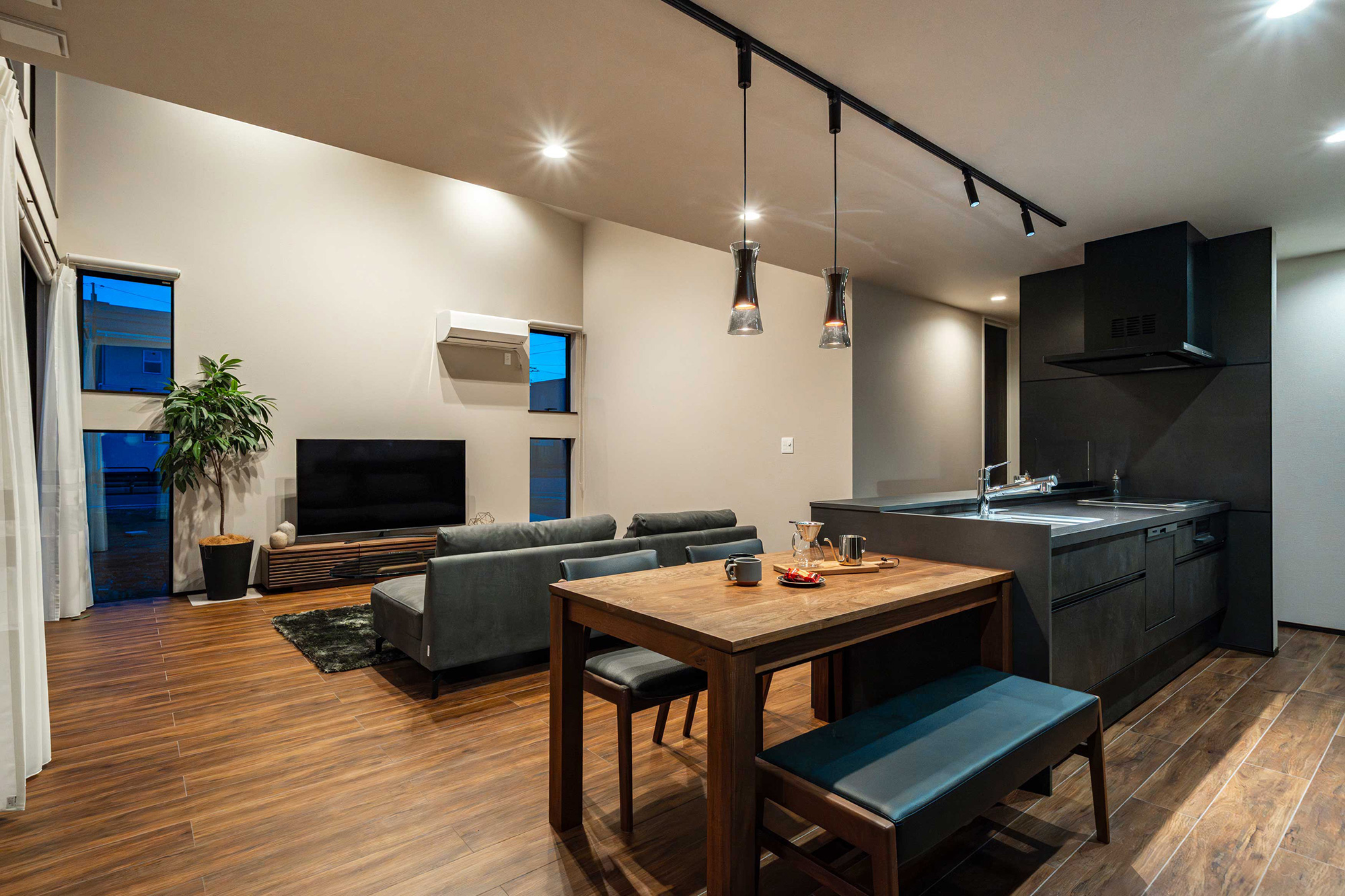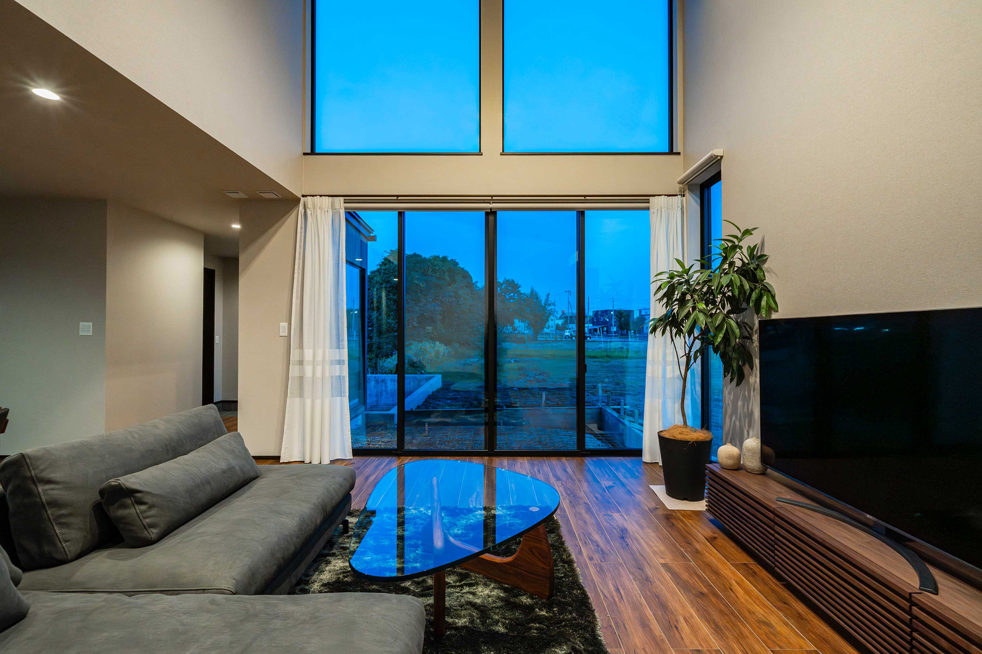 開放感抜群のハイ天井リビング!大開口から差し込む光と陰影が、時間とともに表情を変える贅沢な空間です。
