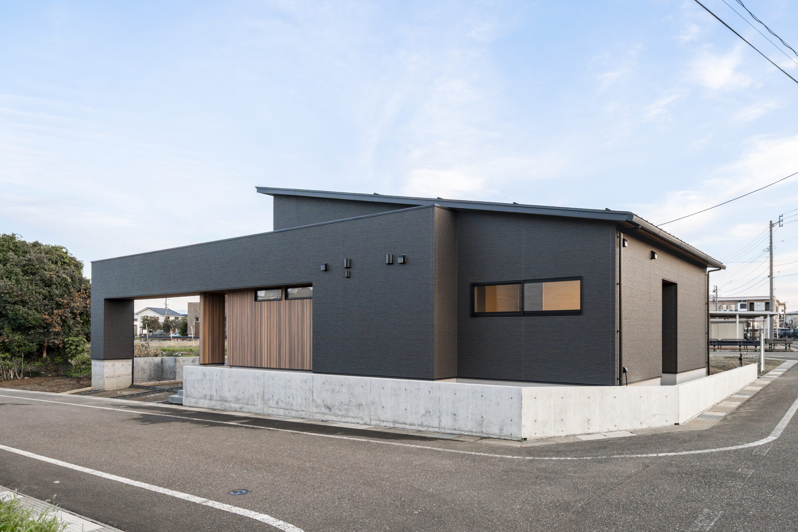 無駄のない水平ラインと、質感豊かな外壁が醸し出す落ち着いた佇まいは、