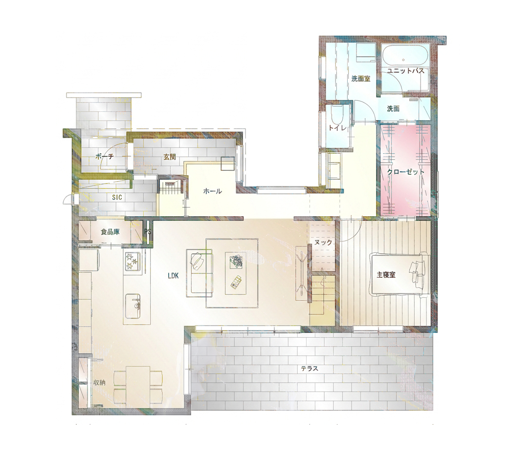 LDK、水回り、そして主寝室までをすべて1階に集約。